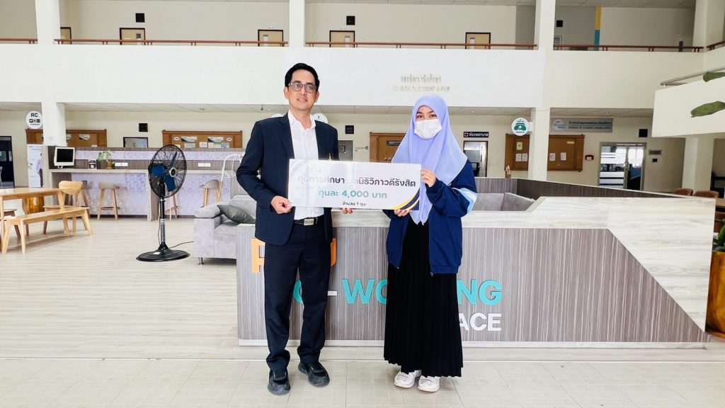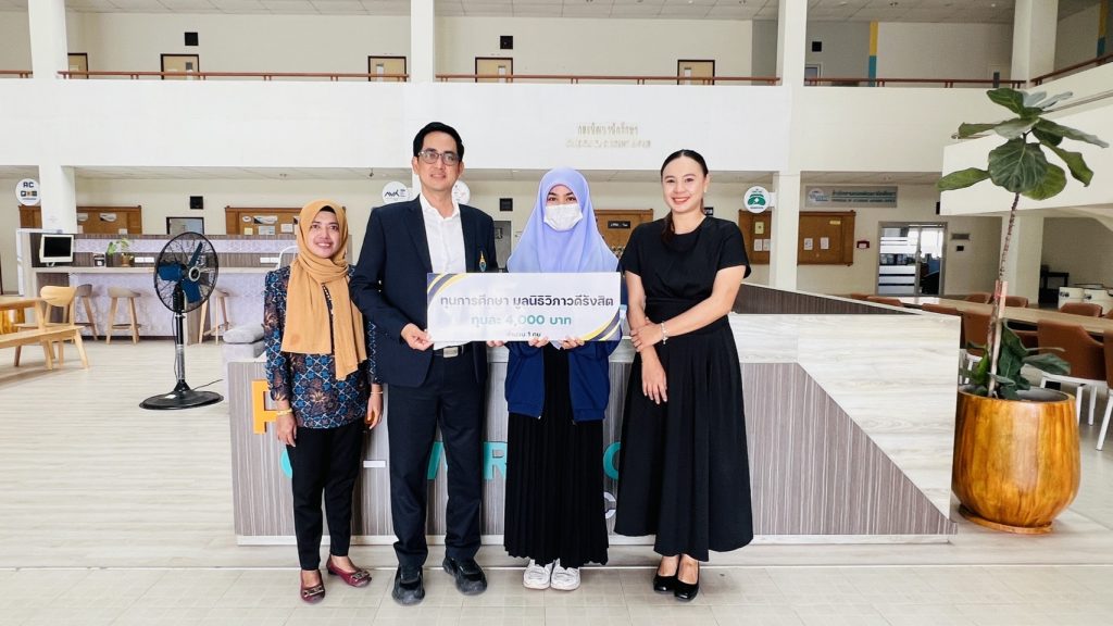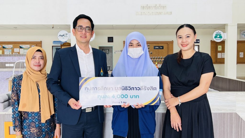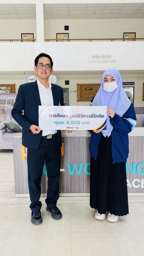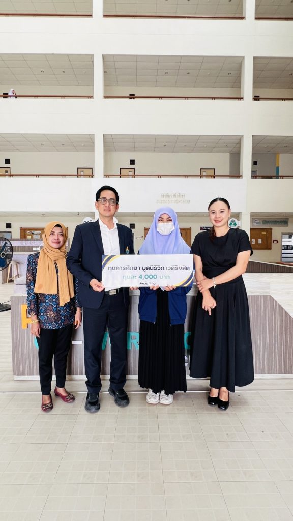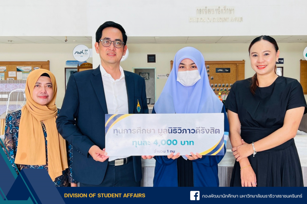ผู้ช่วยศาสตราจารย์วันชัย แก้วหนูนวล รองอธิการบดีฝ่ายกิจการนักศึกษา เป็นตัวแทน มอบทุนการศึกษาของมูลนิธิวิภาวดีรังสิต ประจำปี 2568 จำนวน 1 ทุนๆ ละ 4,000 บาท ให้แก่ นางสาวนูรไอรินดา จาแน นักศึกษาชั้นปีที่ 3 คณะพยาบาลศาสตร์ มหาวิทยาลัยนราธิวาสราชนครินทร์ วันที่ 19 ธันวาคม 2568 เวลา 09.00 น. ณ Co-working Space ชั้น 1 กองพัฒนานักศึกษา มหาวิทยาลัยนราธิวาสราชนครินทร์