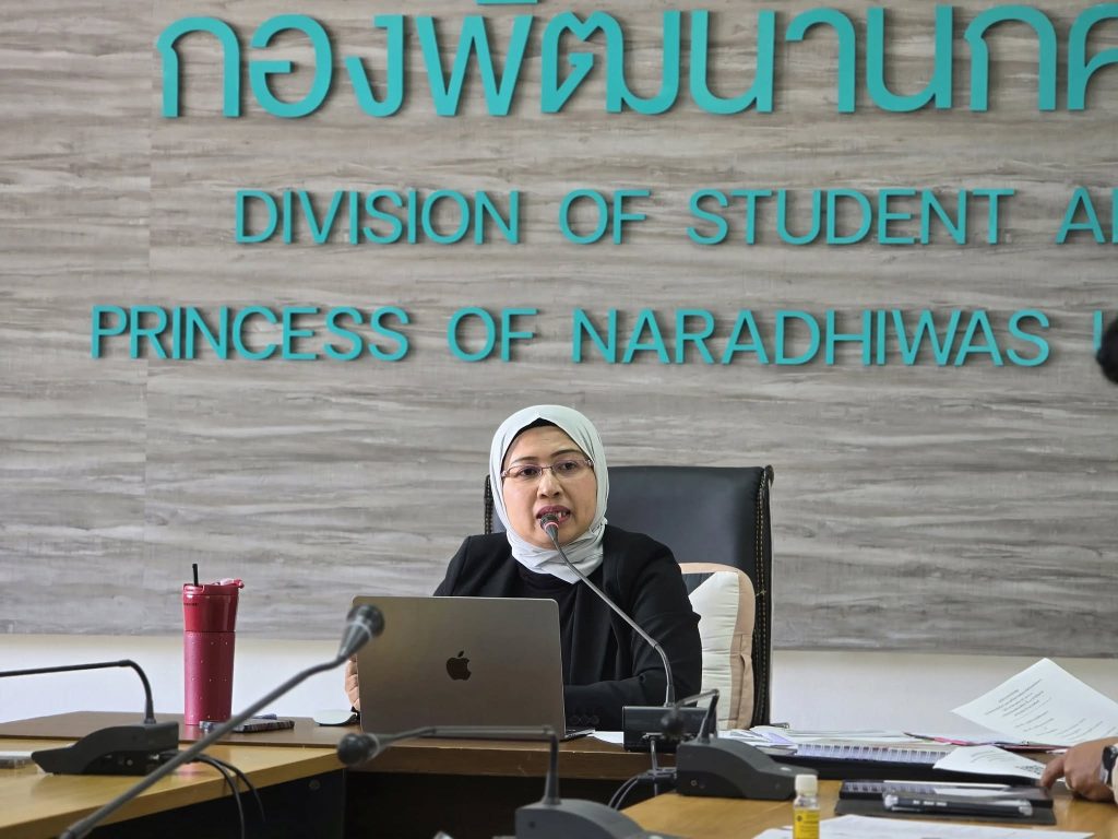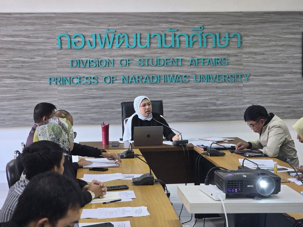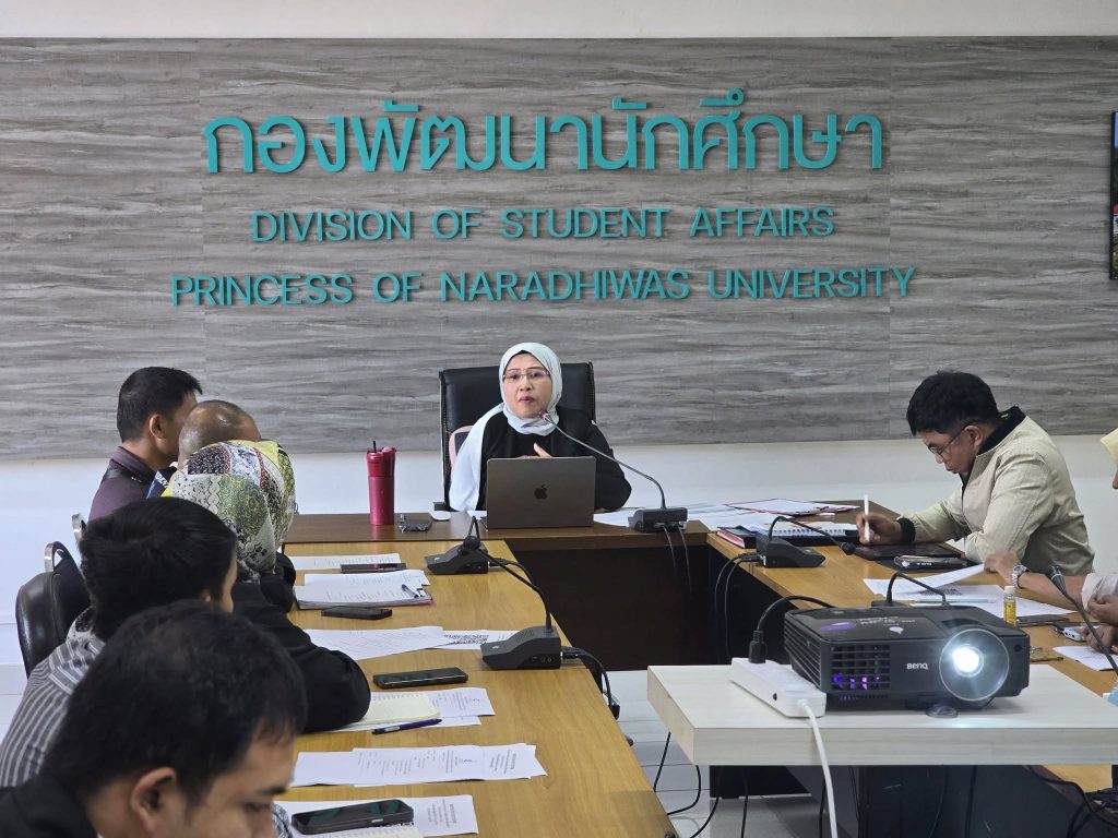 กองพัฒนานักศึกษา มหาวิทยาลัยนราธิวาสราชนครินทร์ ได้จัดประชุมเพื่อติดตามผลการดำเนินงานและเตรียมความพร้อมในการจัดกิจกรรมและโครงการต่าง ๆ ที่จะดำเนินการในปีการศึกษา โดยมี นางสาวอลิสา มะเซ็ง รักษาการในตำแหน่งผู้อำนวยการกองพัฒนานักศึกษา เป็นประธานในการประชุม